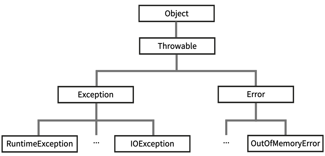 자바에서는 발생할 수 있는 오류를 클래스로 정의해두었다. Exception 클래스와 Error 클래스로 나뉘며 Error 클래스에는 수습 불가능한 오류에 대해 정의되어 있고, Exception 클래스에는 사용자의 실수와 같은 외적인 요인에 의해 발생하는 예외가 정의되어 있다. 특히 RuntimeException 클래스에는 개발자의 실수로 발생하는 예외들이 정의되어 있다.