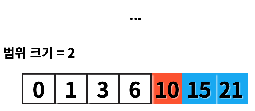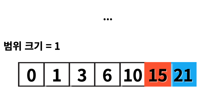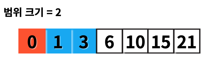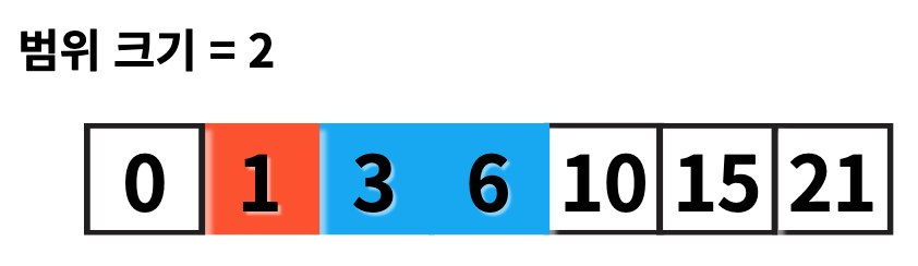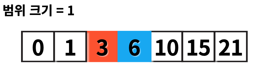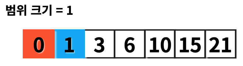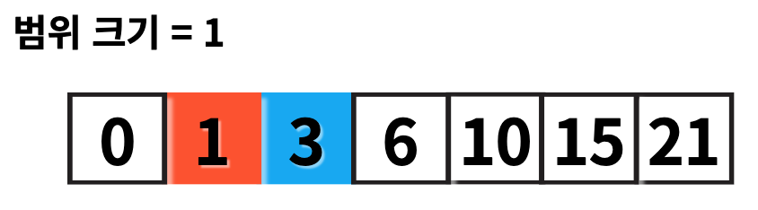 모든 부 배열을 확인하는 방식은 범위의 크기를 늘려가며 진행하였다. 다음 예제에서 빨간색은 빼야 하는 인덱스, 파란색은 합을 구할 범위를 의미한다. (배열에 맨 앞에 0을 추가하여 범위가 1인 경우에도 같은 형식으로 처리할 수 있도록 하였다.) 먼저, 범위가 1인 경우 다음과 같이 유효한 값들을 구할 수 있다.