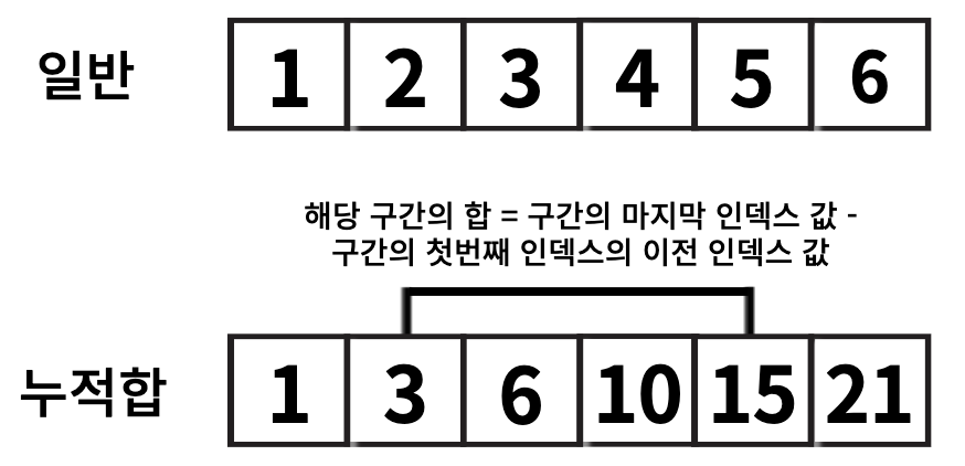 우선 누적합 구간의 합을 빠르게 구하기 위해서 이용된다. 배열에서 특정 범위의 합을 구하고 싶을 때 인덱스를 탐색하며 값을 하나씩 더하는 방법도 있지만 이런 방법은 배열의 크기가 커질수록 비효율적이다. 따라서 현재 인덱스의 값이 이전 인덱스의 값을 포함하는 형태로 배열의 값을 초기화 함으로써 특정 범위의 합을 다음과 같이 구할 수 있다.