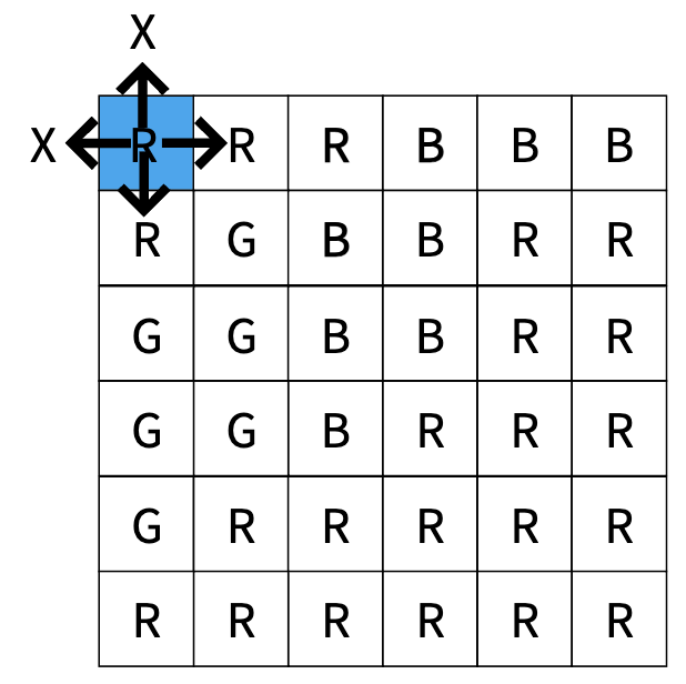 즉, 현재 탐색할 색은 R이다. 현재 위치에서 인접한 4방향에 대해 탐색하며 R과 같은 색이 있는지 탐색을 진행한다. 방문한 곳에 대해서도 인접한 4방향 탐색을 수행한다. 이때 탐색 위치가 범위를 벗어나는 부분은 탐색을 진행하지 않는다.