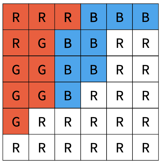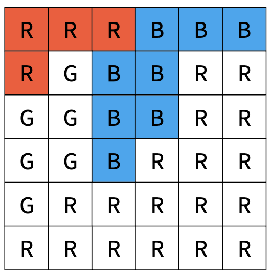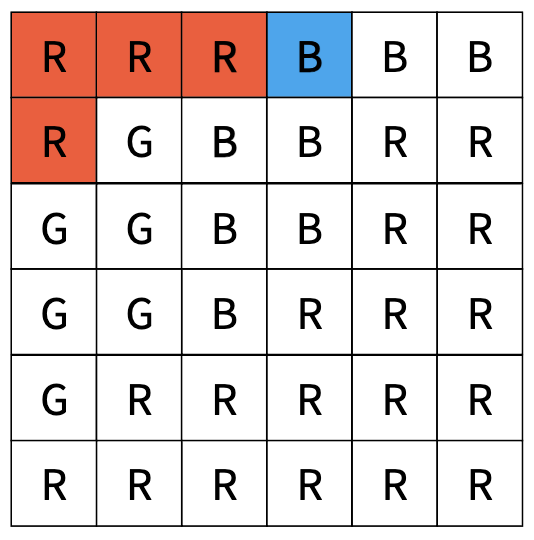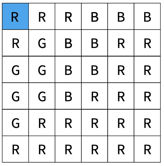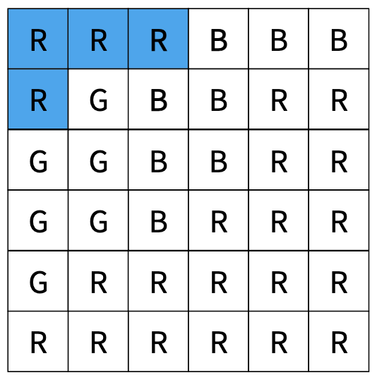우선 입력으로 주어진 2차원 배열 전체에 대해 해당 위치에서 탐색을 수행해야 하는지 결정해야 한다. 다음 예시를 보면 처음 위치의 색이 R인 것을 알 수 있다.