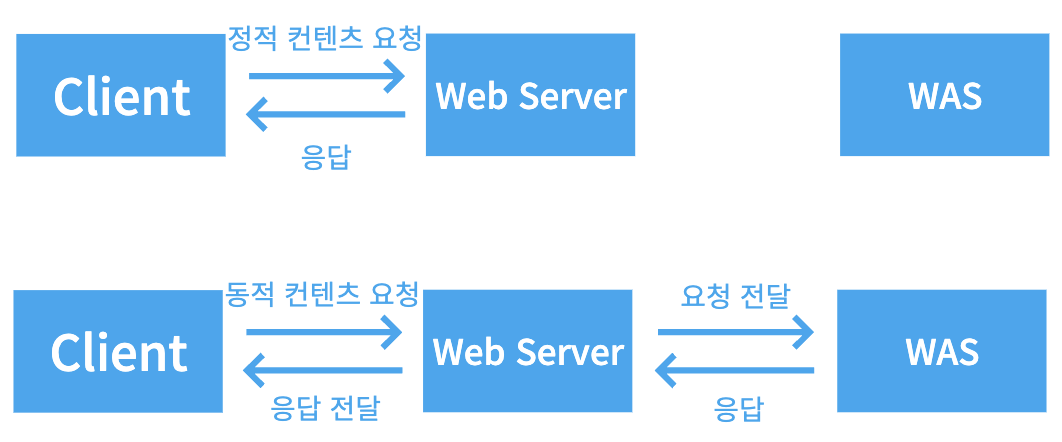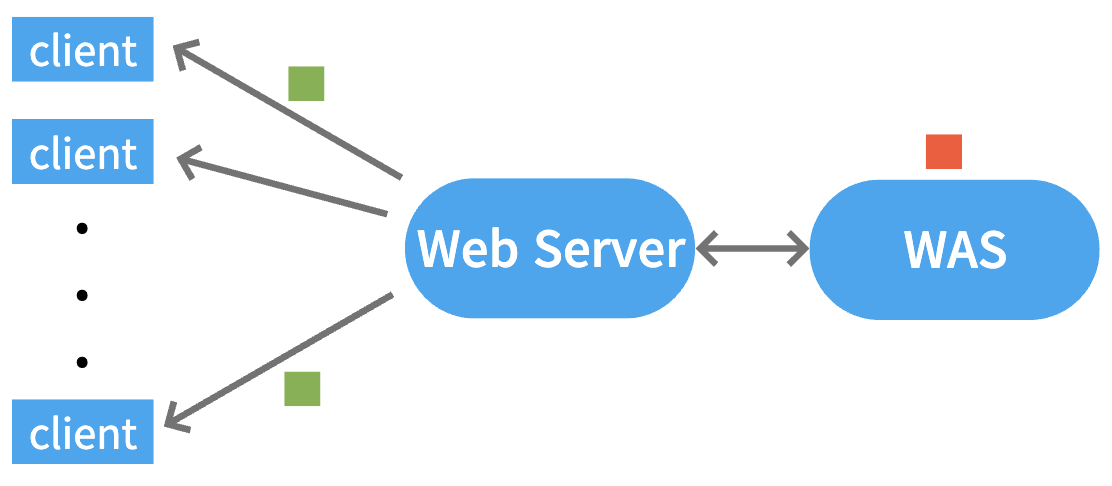 이미지 파일과 같은 정적인 컨텐츠를 클라이언트에서 요청하는 경우 대체로 특별한 처리없이 해당하는 파일을 찾아 전달해주기만 하면 된다. 만약 서버 이용자 수가 많을 때 Web Server에서 정적, 동적 컨텐츠를 전부 처리하고 있다면 어떻게 될까? 동적 컨텐츠 처리에 대한 과정에 의해 빠르게 응답 가능한 정적 컨텐츠에 대해서도 응답이 느려지게 될 것이다. 따라서 Web Server는 동적인 컨텐츠에 대해선 WAS로 넘기고 정적인 컨텐츠에 대한 처리만을 담당함으로써 빠른 응답을 가능케 하고, 서버의 부담을 줄일 수 있다.