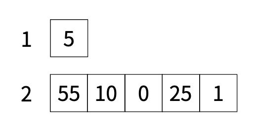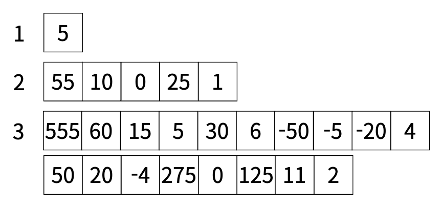 DP의 개념을 이용해 문제를 해결하였다. 위에서 소개한 예제인 5를 이용해 50을 만드는 과정에 대해서 살펴보자. 먼저 5가 1개인 경우를 생각해보자. 숫자 5 1개를 이용해 만들 수 있는 수는 5 하나뿐이다.