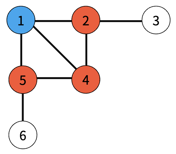 시작 지점은 항상 1번 노드부터이다. 1번 노드와 연결된 노드는 다음과 같이 2번, 4번, 5번 노드를 찾을 수 있다.