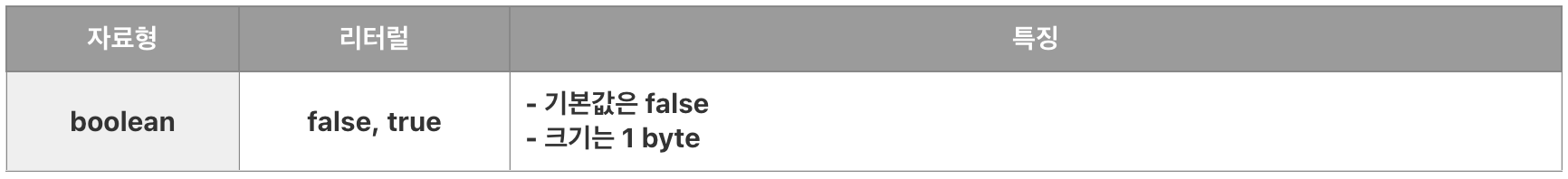 기본형에는 8개의 타입이 있으며, 논리형을 제외한 다른 기본형들은 서로 연산 및 변환이 가능하다. 문자형은 문자를 정수(유니코드)로 저장하기 때문에 정수형과 크게 다르지 않다.