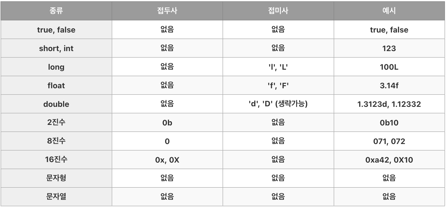 - 리터럴의 값이 변수의 타입의 범위를 벗어나거나, 리터럴의 타입이 변수의 타입보다 저장범위가 넓으면 컴파일 에러가 발생한다.