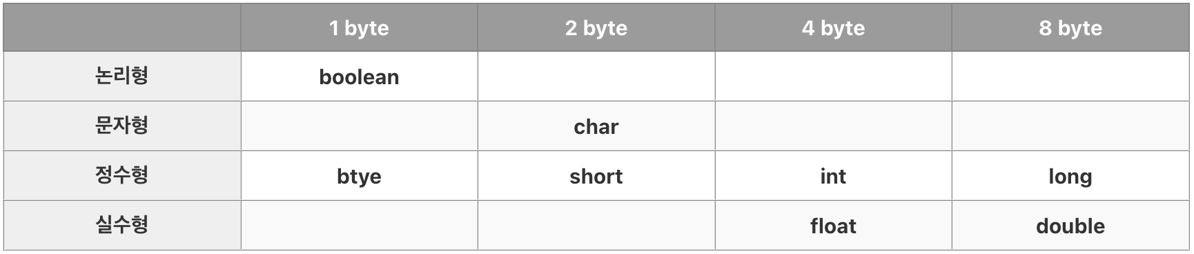 A. 논리형 boolean, 문자형 char, 정수형 byte, short, int, long, 실수형 float, double 이 있으며 순서대로 1, 2, 1, 2, 4, 8, 4, 8 byte의 크기를 가진다.