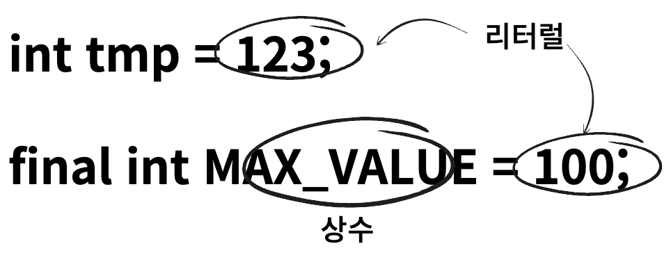 리터럴은 변수나 상수에 실제 저장된 값(1, 2, 'A' 등) 자체를 의미한다. Java에선 상수를 다른 개념으로 정의하였기 때문에 기존의 상수를 지칭할 필요가 있기 때문에 리터럴이라는 용어를 사용하였다.