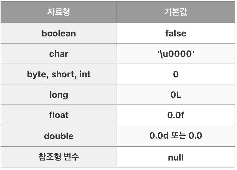 ※ JVM의 피연산자 스택이 피연산자를 4 byte 단위로 저장하기 때문에 크기가 4 byte보다 작은 자료형의 값을 계산할 때는 4 byte로 변환 후 연산이 수행된다. 기본적으로는 int 형을 사용하고, 메모리 절약이 우선적일 때는 byte나 short를 사용한다.